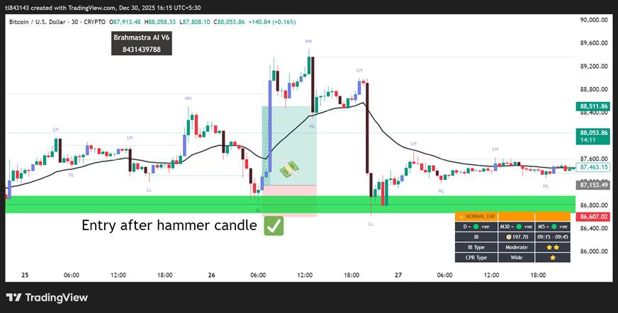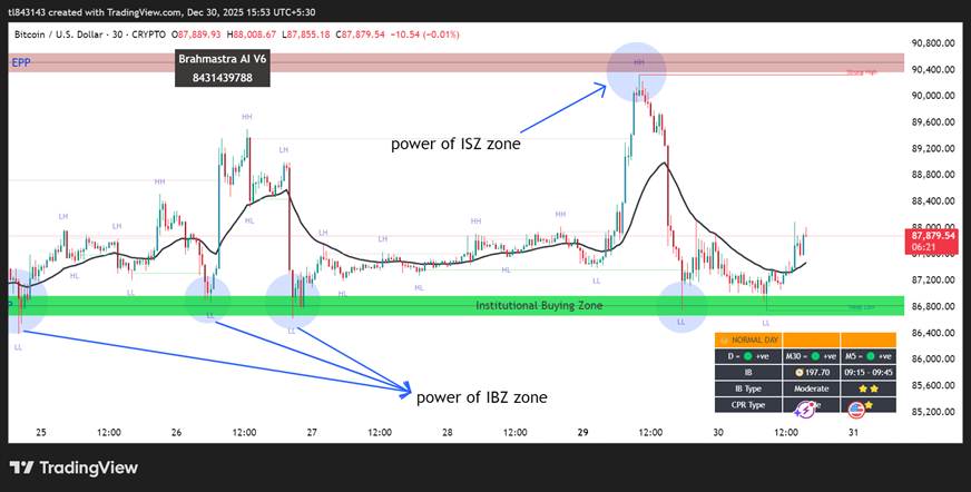 In the Brahmastra AI Indicator, institutional activity is clearly mapped using two powerful zones: