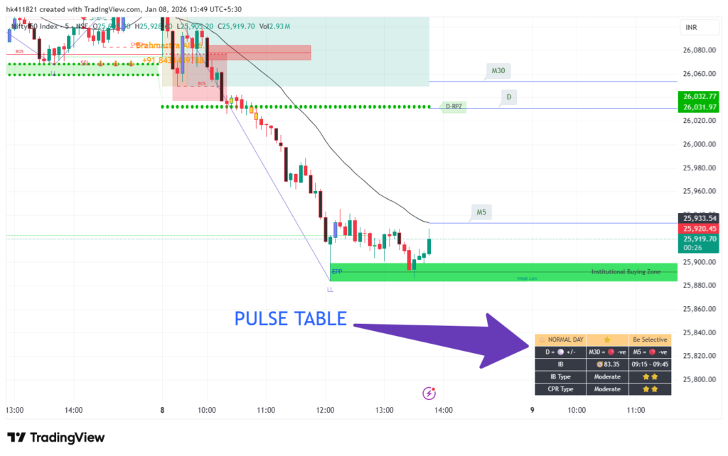 According to Market Profile theory, the market often consolidates within the IB range. Stop-loss hunts and fake moves are more common during this phase. The Pulse Dashboard clearly guides traders to avoid trading inside the IB zone and wait for structure clarity.